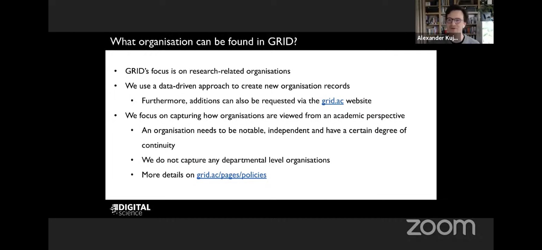 Друга доповідь “Benefits of using GRID IDs”  було виголошено Олександром Куджафом, у якій він детально розповів про передумови створення реєстру дослідницьких організацій GRID, описав набір метаданих, які представлені у GRID ID та наголосив про переваги їх використання.