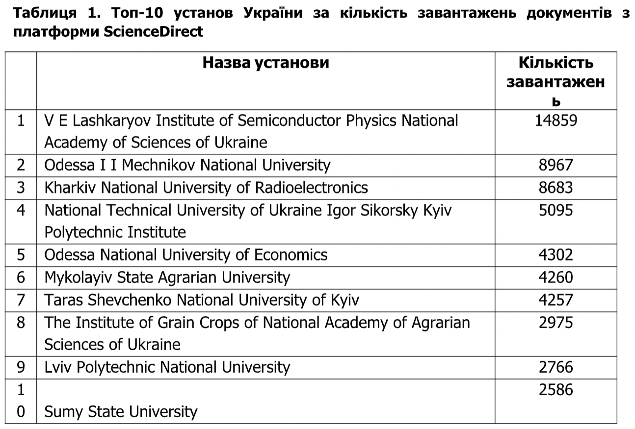 За означений вище період найбільший активно працювали та завантажували електронні книги користувачі Інституту фізики напівпровідників імені В. Є. Лашкарьова, Одеського національного університету імені І. І. Мечникова, Харківського національного університету радіоелектроніки, Національного технічного університету України «Київський політехнічний інститут імені Ігоря Сікорського» та Одеського національного економічного університету (Табл. 1).